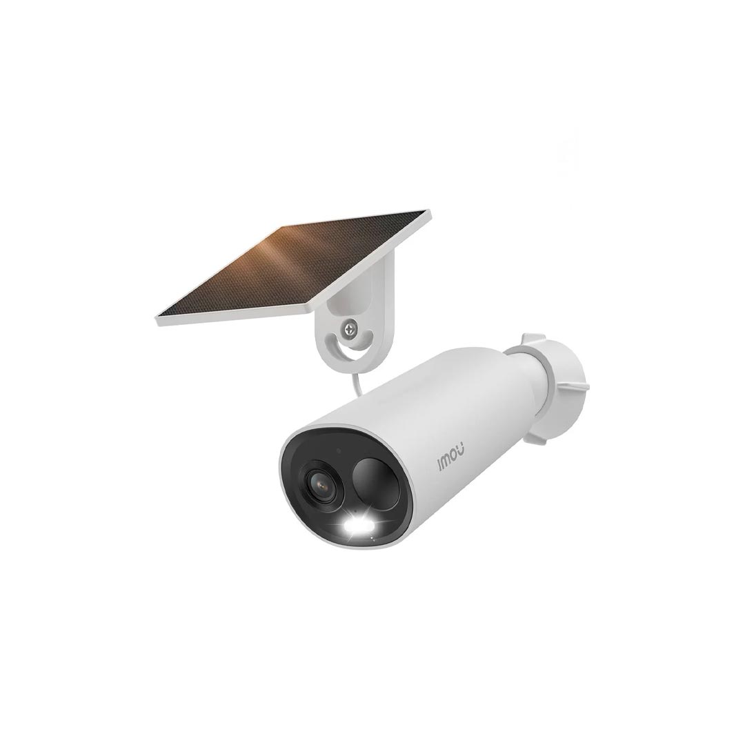 Es una cámara IP WiFi de 3MP totalmente inalámbrica con batería recargable, panel solar de 2.2 W, lente gran angular de 2.8 mm, visión nocturna IR de hasta 10 m, audio bidireccional y detección PIR, ideal para vigilancia exterior sin cableado.