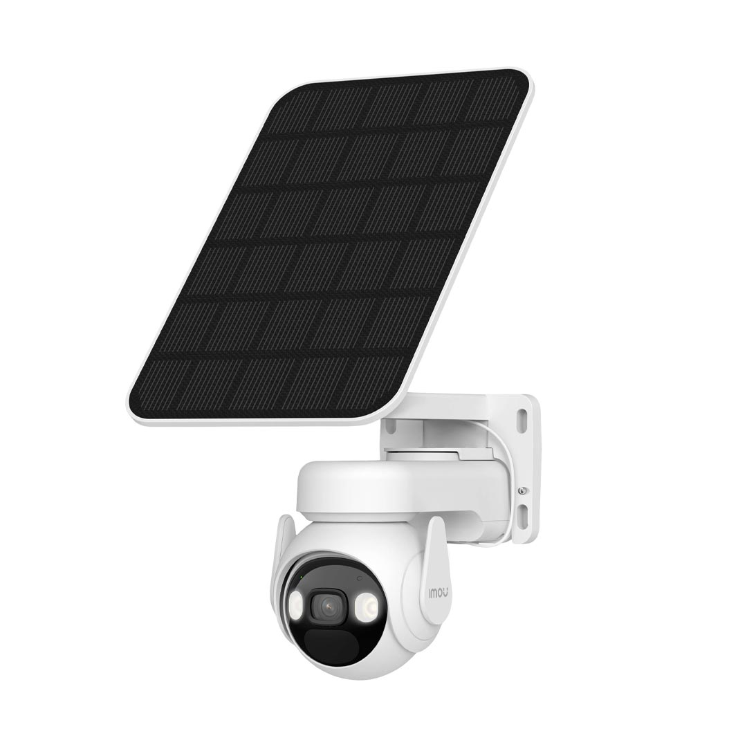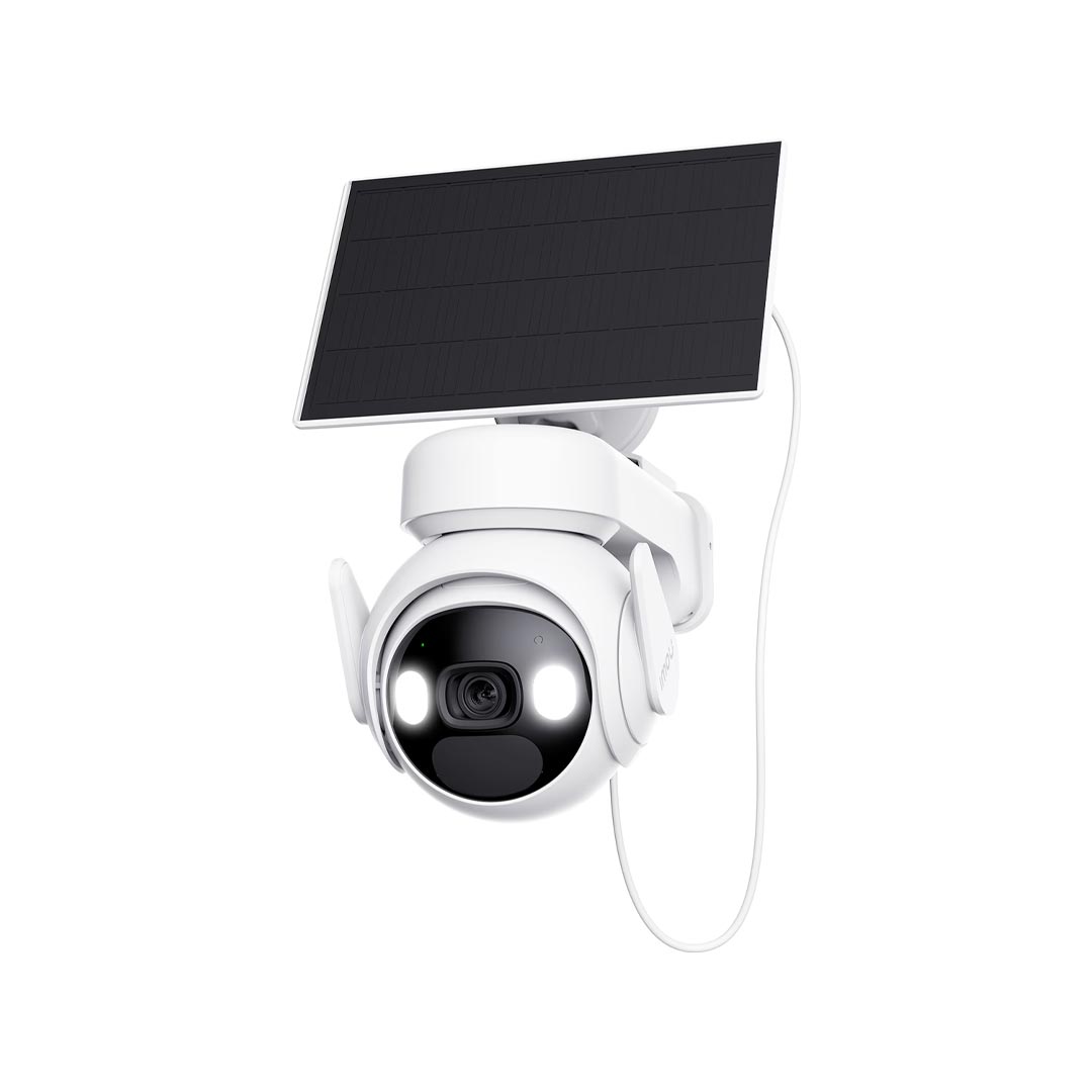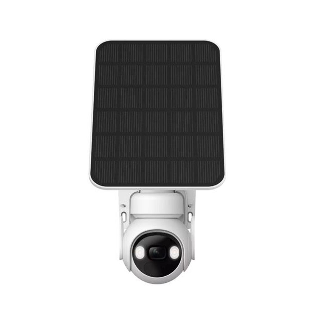 Es una cámara IP WiFi de 3MP con movimiento motorizado PT, batería recargable, panel solar de 3 W, lente gran angular de 3.6 mm, visión nocturna IR de hasta 10 m, audio bidireccional y detección PIR, ideal para vigilancia exterior sin cableado.